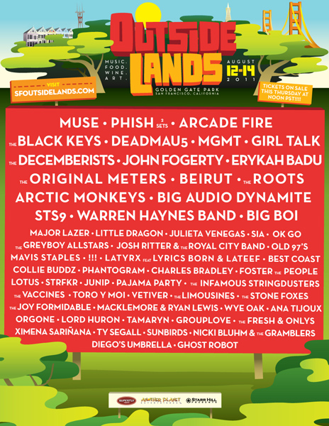 Just released, check out the line-up for Outside Lands Festival August 12-14 in San Francisco.  Should be an incredible three days with Phish, Muse and Arcade Fire headlining.  Throw in The Black Keys, Deadmau5, The Roots, Foster The People, The Decemberists, Girl Talk, MGMT, Beirut, Arctict Monkeys, STS9, Warren Haynes, Big Boi, The Original Meters, Major Lazer, !!!, Joy Formidable, Toro Y Moi, The Original Meters and a whole lot more, you have yourselves a pretty sick group of musicians.